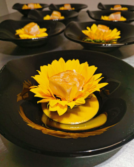Este es uno de los platos más bonitos; filete de robalo sobre un girasol con pipián de semillas de girasol, nos remonta al cuadro de los Girasoles de Vincent Van Gogh